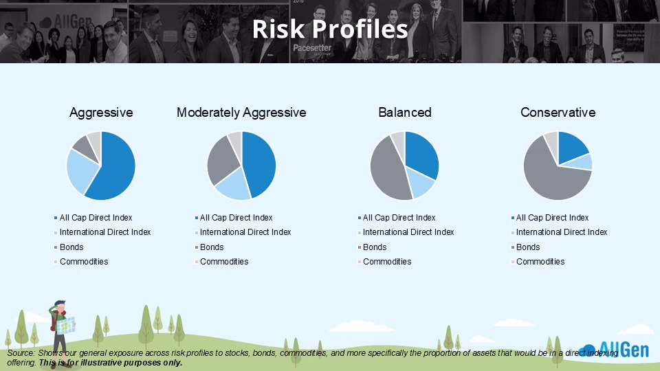 At AllGen, direct indexing applies to the equity portion of the portfolio, while bonds and other allocations remain aligned with our broader tactical framework. We utilize a portfolio strategy, which offers competitive pricing, daily tax-loss harvesting scans, and seamless integration without requiring a separate account structure.